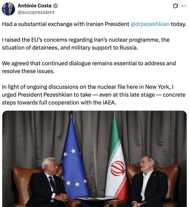 آنتونیو کوستا با انتشار پیامی در شبکه اجتماعی ایکس نوشت: امروز گفت وگویی مفصل با رئیسجمهور ایران، آقای پزشکیان داشتم.
